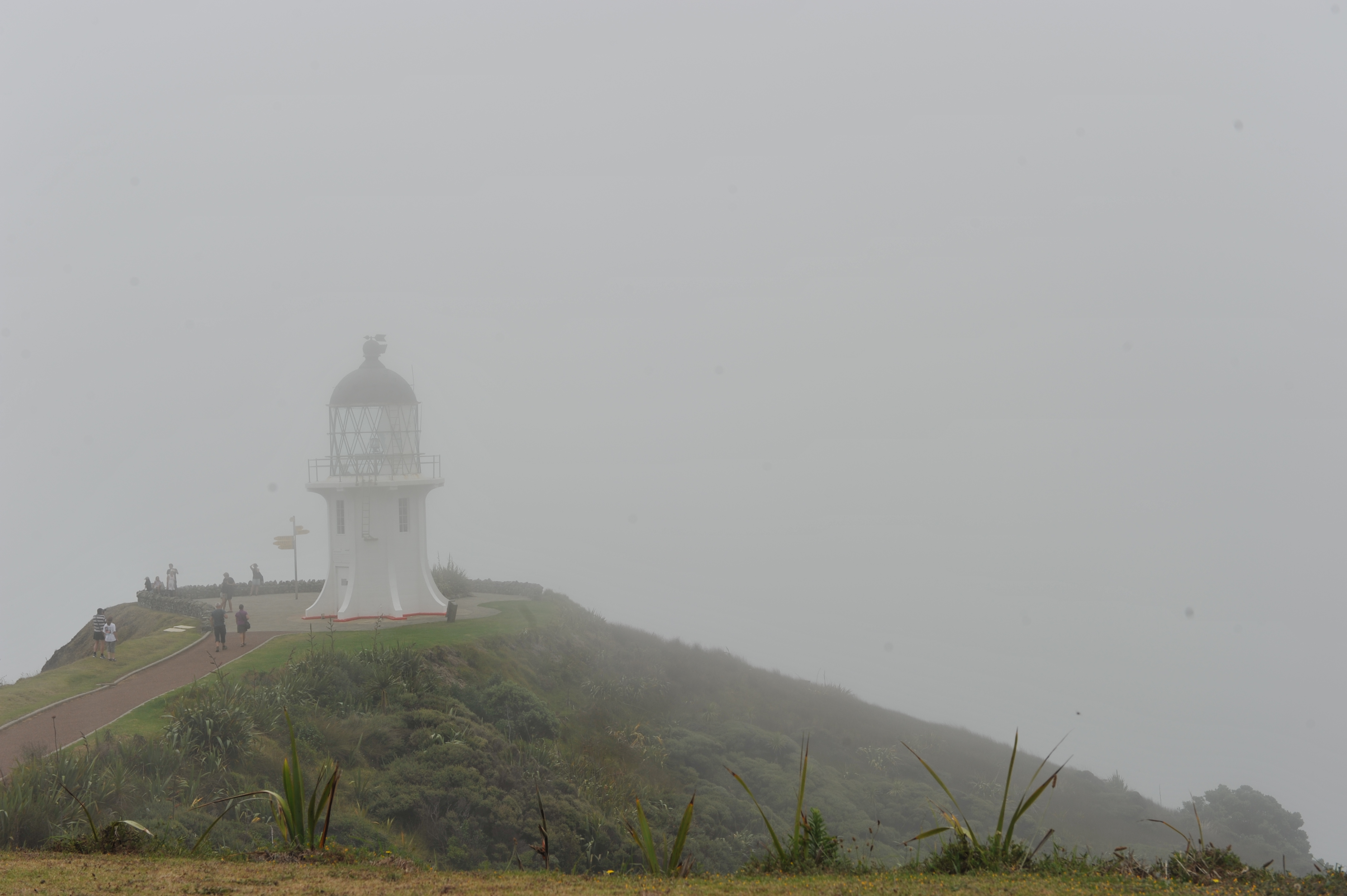 Drizzle was still in the air as we set off to drive to Cape Reinga the next morning. Although we wondered a couple of times if the low cloud masked the end of the world, we enjoyed the views we had through the cloud and were rewarded with one or two quite clear moments both along the way and at the Cape itself. One interesting moment was when we reached a roundabout and I expected to go straight on to the gravel road which was supposed to take us to the Cape, only to find that we had already reached the Cape: beware out-of-date information in guidebooks!