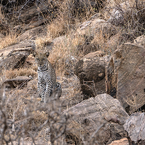 Various vans told us there was a leopard about, but he successfully evaded every attempt to find him until our evening drive. Chris had us leave a little early and drove like a man with a mission to the place where we had seen the leopard yesterday. And there he was, hiding on top of the rocks, camouflaged by branches. He did come down briefly and posed for photos but only for a minute before retreating behind the branches again.