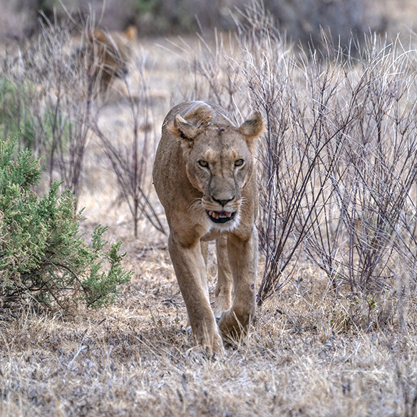 We had already seen a couple of lionesses by then and found various other animals but nothing really exciting until we drove to a spot where there were about six vans stationary, with all their inhabitants standing up and pointing cameras to the right. Slowly we saw them-FIVE lionesses- all prowling through the undergrowth supporting one another as young lionesses do. Two of them came within about five feet of the car. It never crossed our minds that they could easily leap through the open windows! They didn’t and we live to tell the tale!