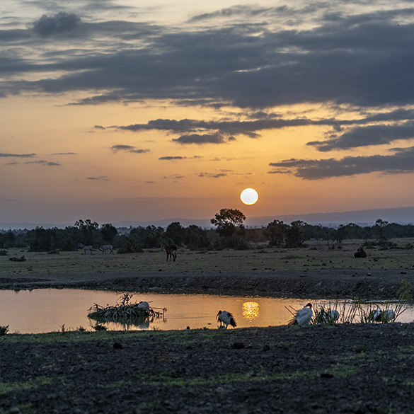 Chris wanted an early start as he was concerned that we might not be comfortable in the heat of the day, so breakfast was at 6.30 – the earliest possible- with images of sunrise over the waterhole taken between courses. One of the delights of Sweetwaters Ol Pejeta has been wondering what we might see at the waterhole and it hasn’t disappointed with warthogs, water buck, impala, zebra and rhino spotted at different times in addition to the resident maribou stork and the flock of sacred ibis.