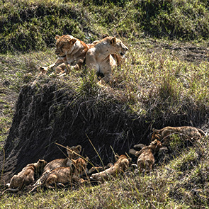 Although we had a destination, this was also a game drive and we spent a good thirty minutes enjoying the antics of eight young lion cubs- two different litters – as they had a morning nap in the shade and then began playing with one another and with their mothers. We had just missed cubs on our last visit so were very happy to have seen this especially as they were out in the open and easy to see.