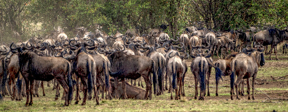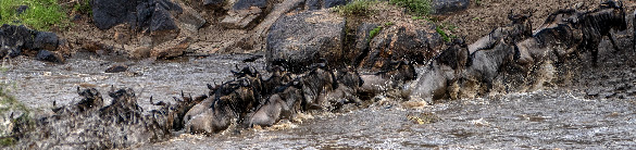 Chris had told us that a crossing lasted a very short time – and I had found that hard to believe until I realised that he was talking about the crossing of an individual beast: the one we saw took more like ten minutes with the numbers involved. The one disappointment, if there were any, was that there were no zebra in the group. Often they are first to go.
