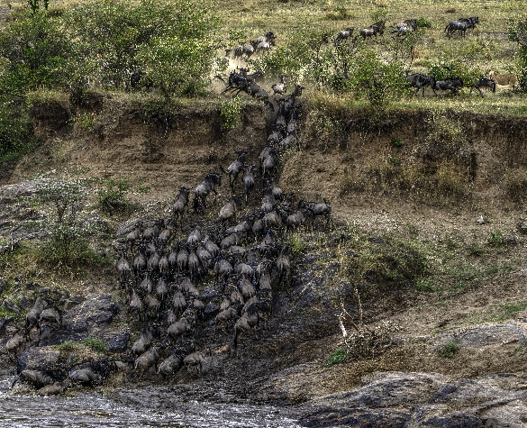 Cars are instructed to hold back when viewing a crossing to ensure that animals are free to go through without hindrance. So we did just that as the herd gathered to our left. Then the cars moved and suddenly we had a clear view of the wildebeest running and jumping, jostling for position as they crossed the river to reach new pastures.