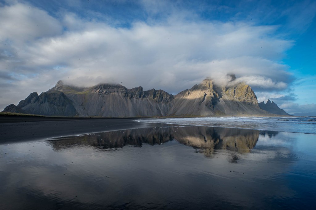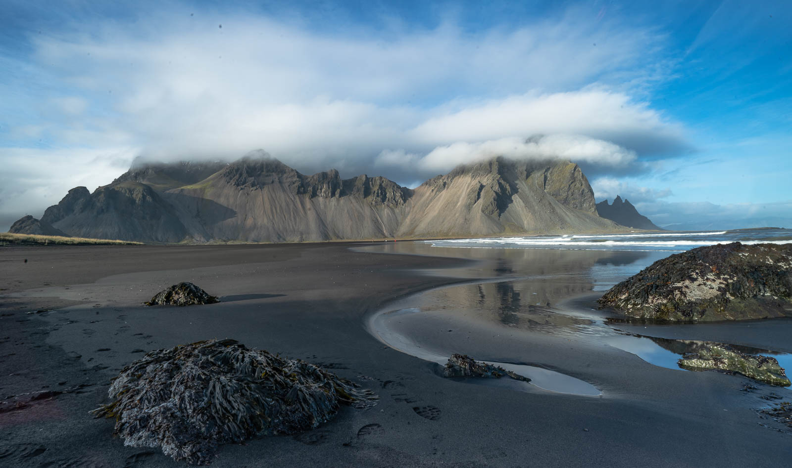 Then we were off to Stokksnes the most southeasterly point of the country, famous for black sand dunes and views of the Vestrahorn mountain range. We were warned that wet feet might well be the result of taking photographs on the water’s edge – and they were!