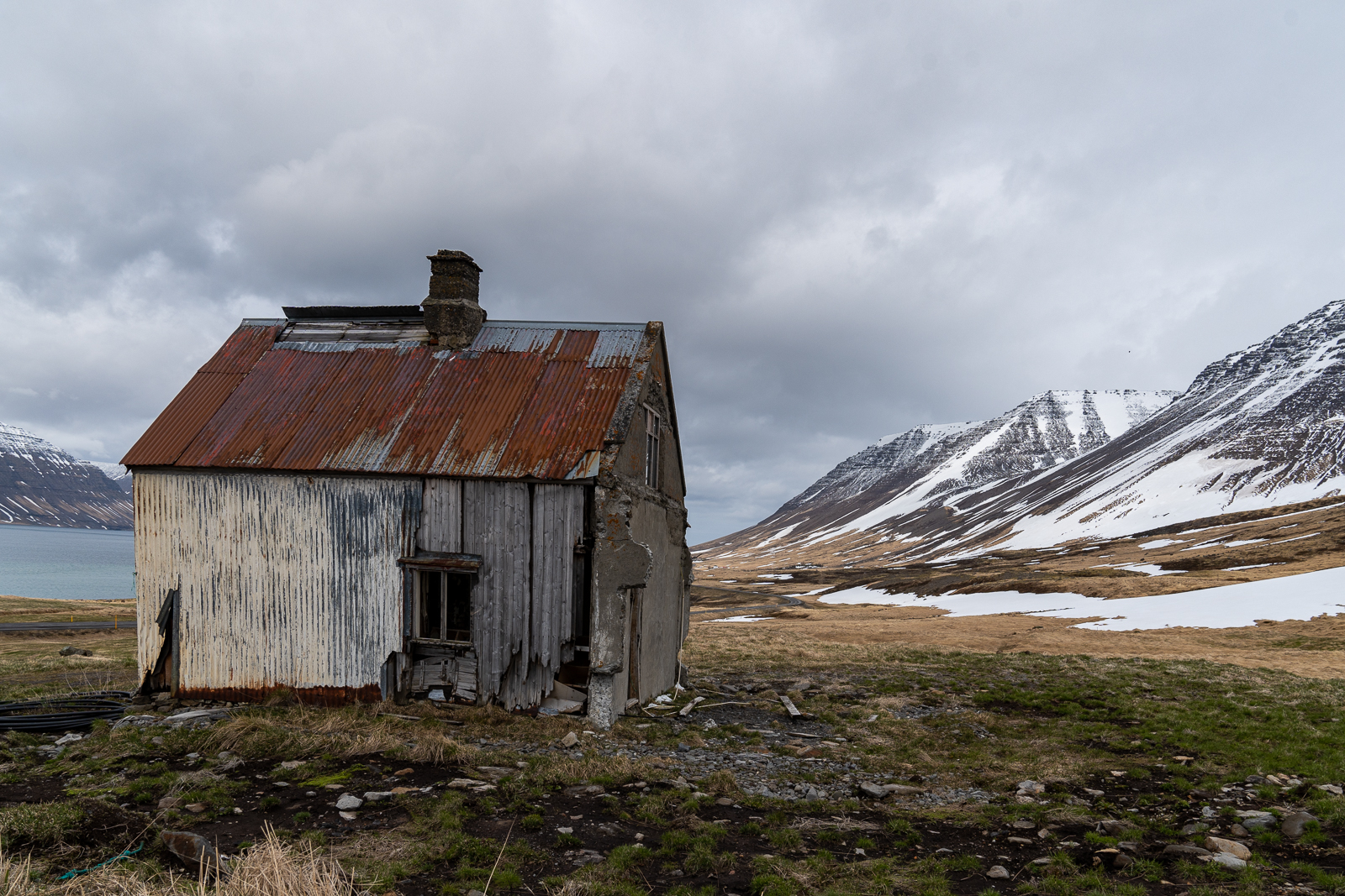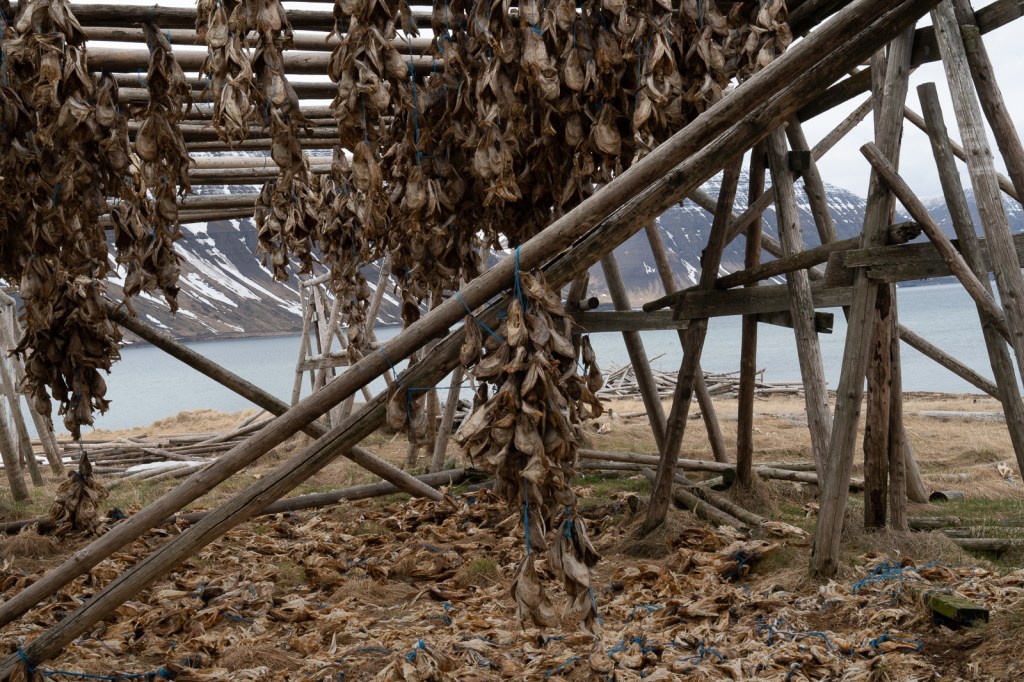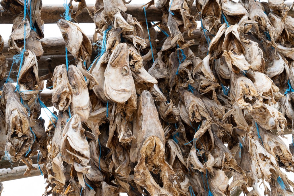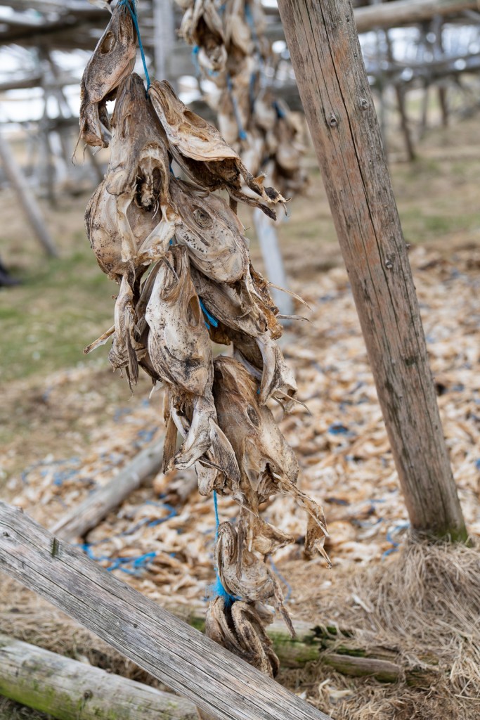 Driving back along the fjord we stopped to photograph the drying racks with dead fish heads by the hundred