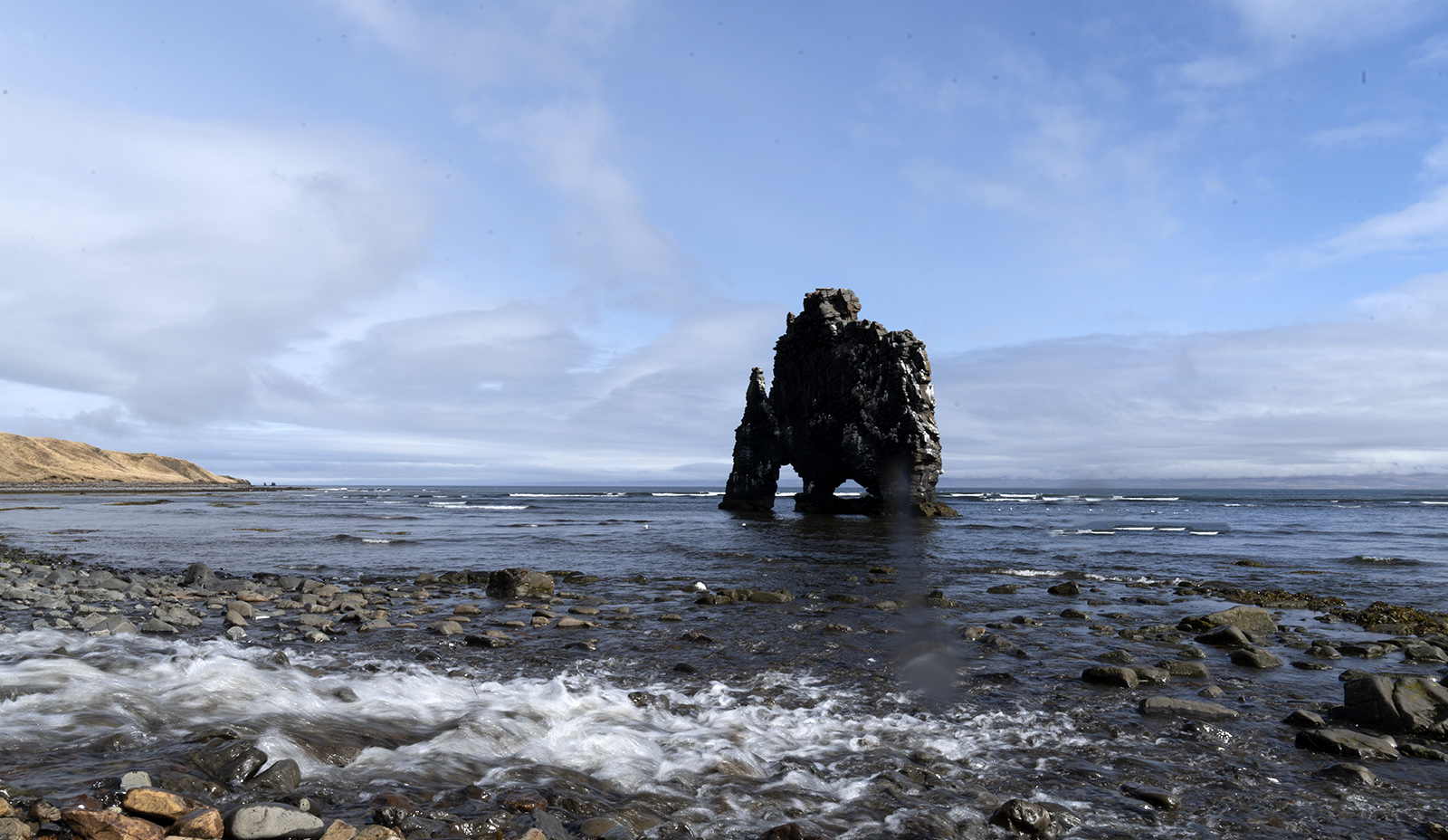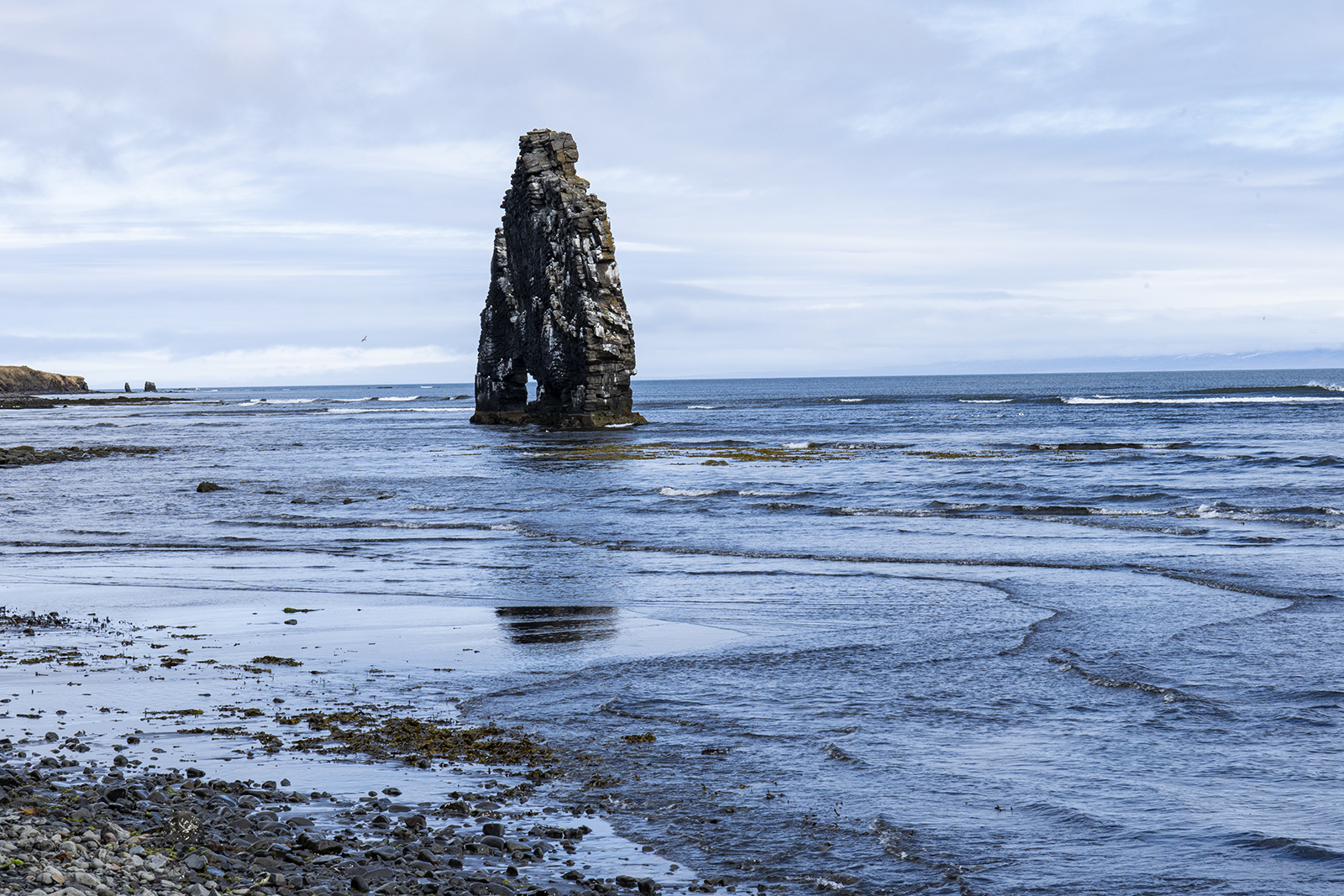 We started the day at Hvitserkur, where a huge rock is thought of as a dinosaur, though, to me, it resembled an ancient elephant more. The car was parked at the top of a path which was fairly steep in parts and on the way down I did think twice about whether I’d manage to get back up – but I did, and after a very pleasant time playing with angles for shots of the dinosaur at the edge of the beach, watching the seals on a sandbank and, without great success, encouraging them to come closer, we were off again.