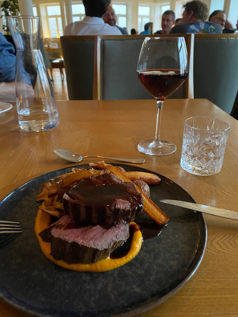 Dinner that night was relaxed as we took full advantage of our surroundings. We all decided to have the three course menu and were served traditional seafood soup (though at least two of us wondered if we were being given a non-traditional version as the bowls were brought with the seafood but no soup… that was poured over the seafood at the table)! The main course was beef and we were expecting nouvelle cuisine size portions only to find the plates piled high with what looked like two fillets of beef as well as fresh vegetables. This was the first day I hadn’t eaten fish! And then, of course, there was the chocolate cake dessert…..