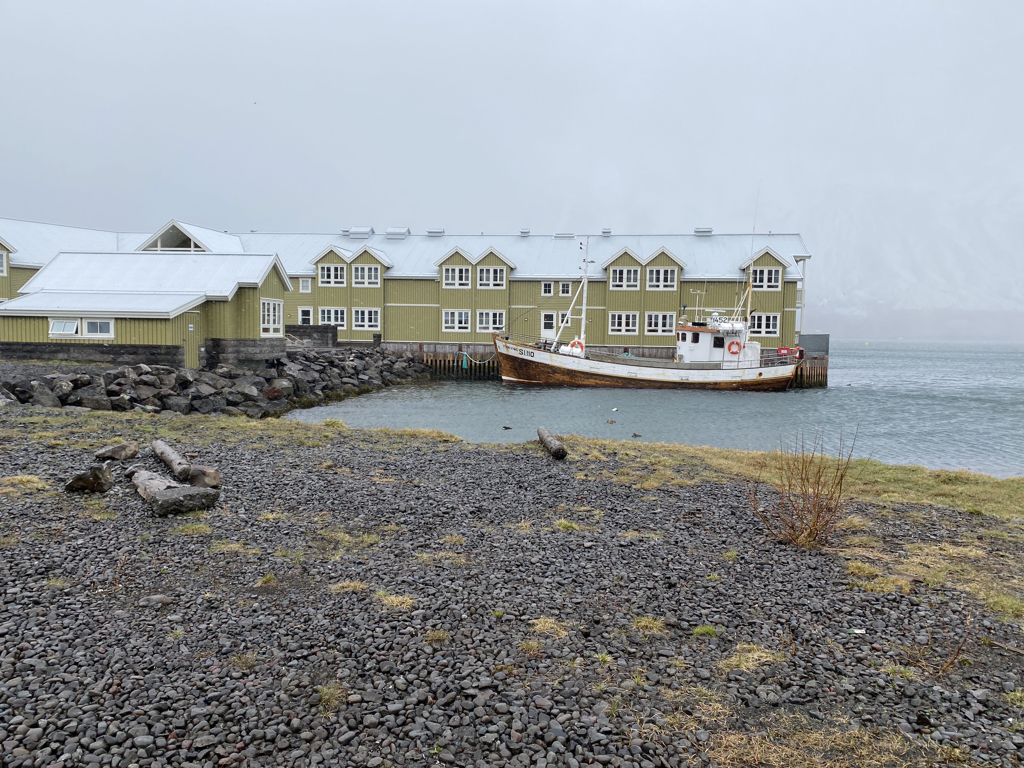 Back on the road we drove through fairly heavy snow showers before reaching the farthest north point of our journey, the small fishing port of Siglurfjordur. The hotel here was a real treat with views overlooking the harbour, interesting despite the constant rain.