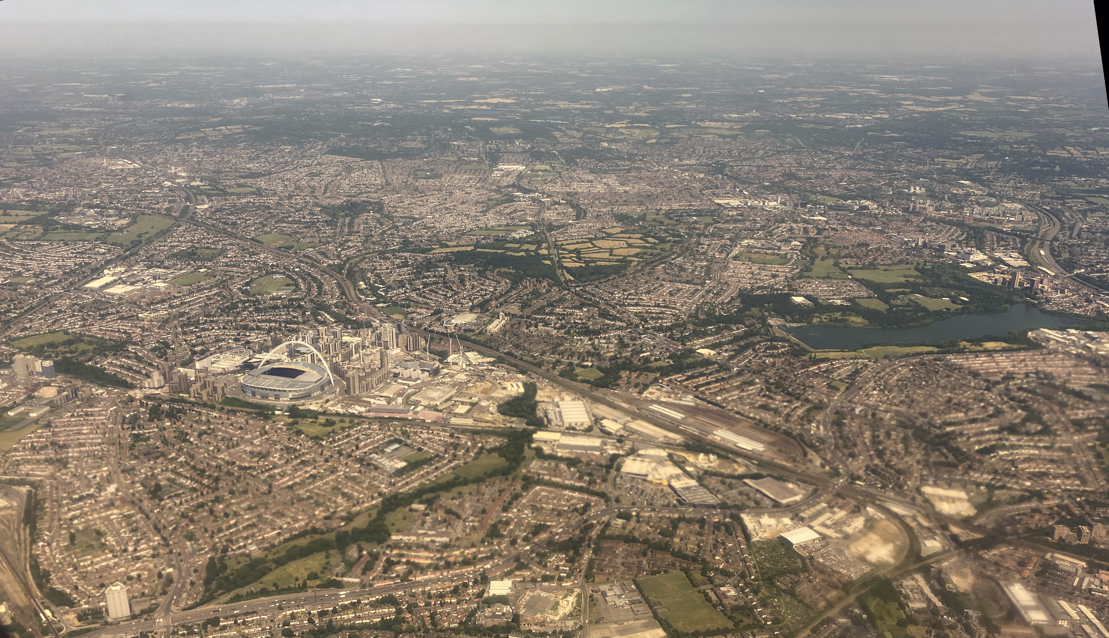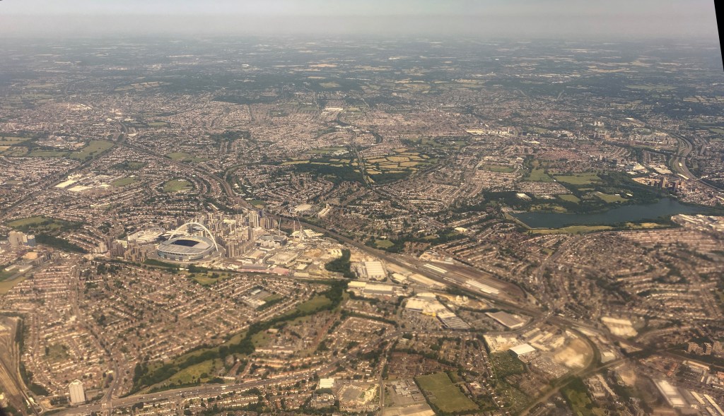 I’m always amazed at how much variety there is in the skies on a flight and on how much of the areas we fly over can be identified. A favourite from the past is a photo of Sydney harbour featuring the bridge, the Opera House and a myriad of small yachts but I quite like this view of Wembley, too.