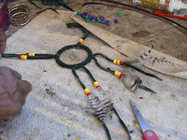 The wife was busy stringing beads while the husband was making a dreamcatcher