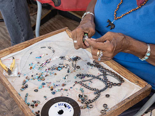 Along the way we found a couple of places where Native Americans were selling handmade jewelry. Of course the beads came from other parts of the US ( though from tribal areas) and the silver work was not always local. I checked because I had nearly bought a couple of gifts at the Gouldings’ shop, only to realise, just in time, that they were not local, but made in India. Anything I have bought is local. At one roadside stall where I bought a couple of things I spoke with the grandparents of a young woman who was ‘manning’ one of the other stalls. They were working while attracting custom and were happy to be photographed at work.