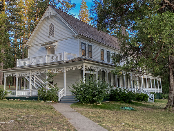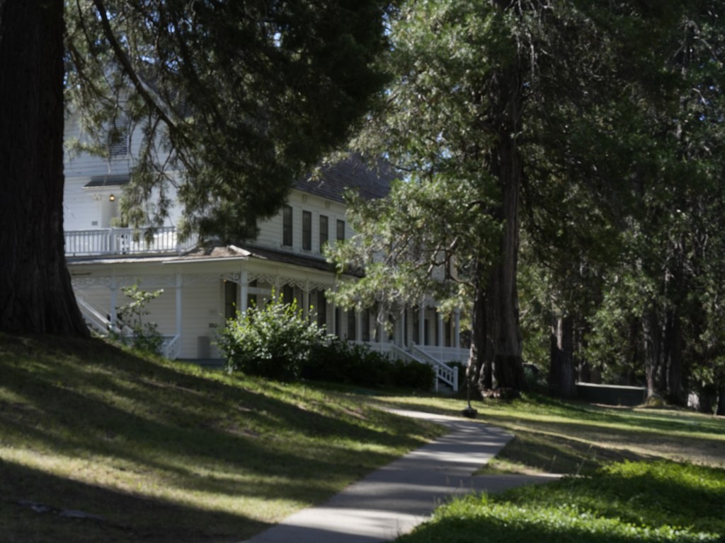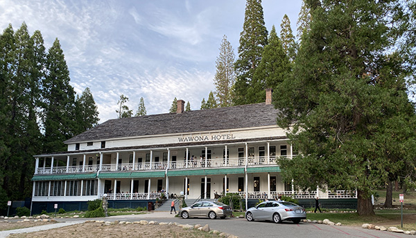 We had found a filling station which also sold good pre-packaged salads and really good smoothies within striking distance of Yosemite. Twenty miles or so – and many steep hairpins – later we reached the entrance to the park. The ranger on duty must have thought he’d met a crazy woman when I asked ‘How much further to Wawona?’ Sympathetically, her replied, ‘Only another four or five miles’. Phew!! But four or five miles of the same type of road. That was OK and we reached the Wawona Hotel before dusk which was a relief.
