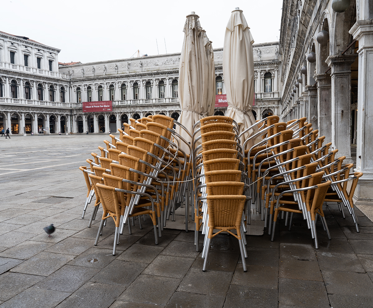 I was also drawn to the stacks of chairs outside the cafes where visitors had been enjoying coffee in the square the first time I walked through: now they were stacked to stay dry. Even the pigeons looked as if they were seeking cover and there was just one pedestrian visible across the square as opposed to the hoardes taking selfies a couple of days ago.