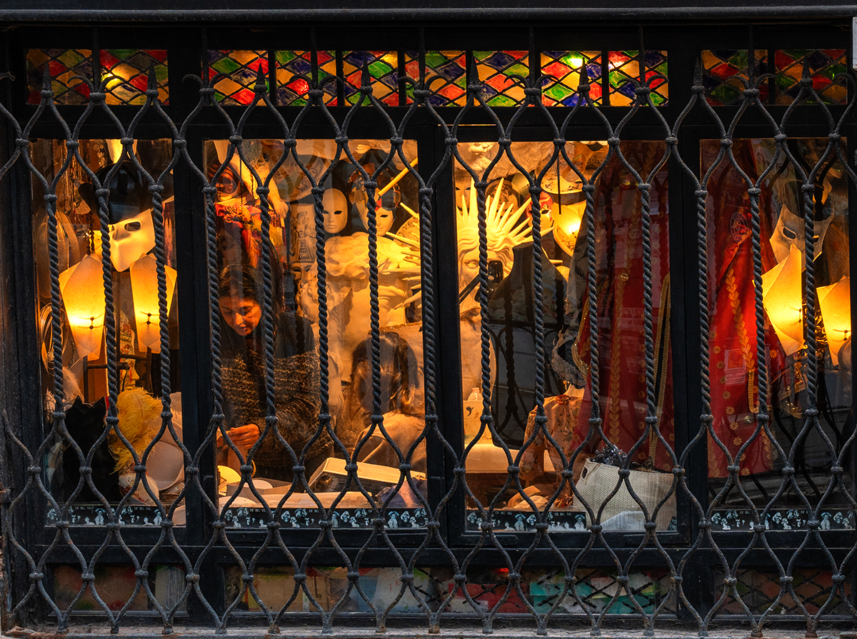 When first we looked at the shop with its amazing window displays we saw a sign saying ‘We are in the workshop in front’, then spotted the window on the other side of the small canal where ladies were clearly working on costumes and masks for Carnivale, so I asked if we could take some photos while they called the man to show us the masks.