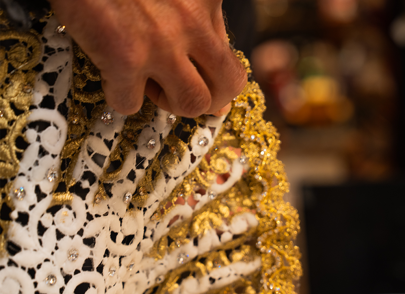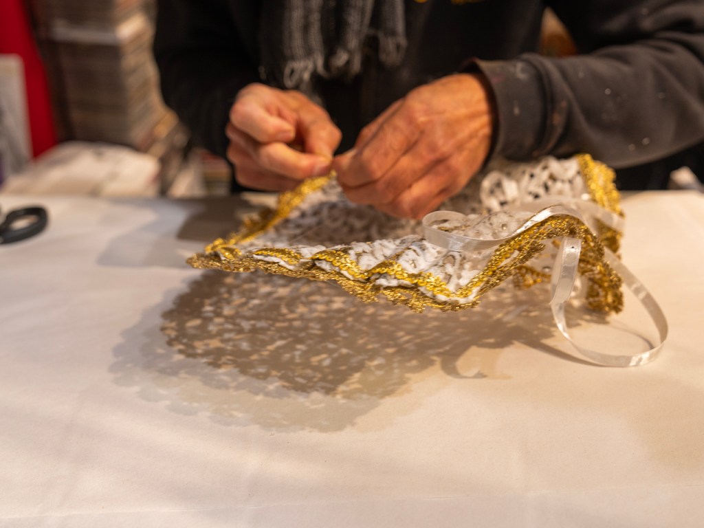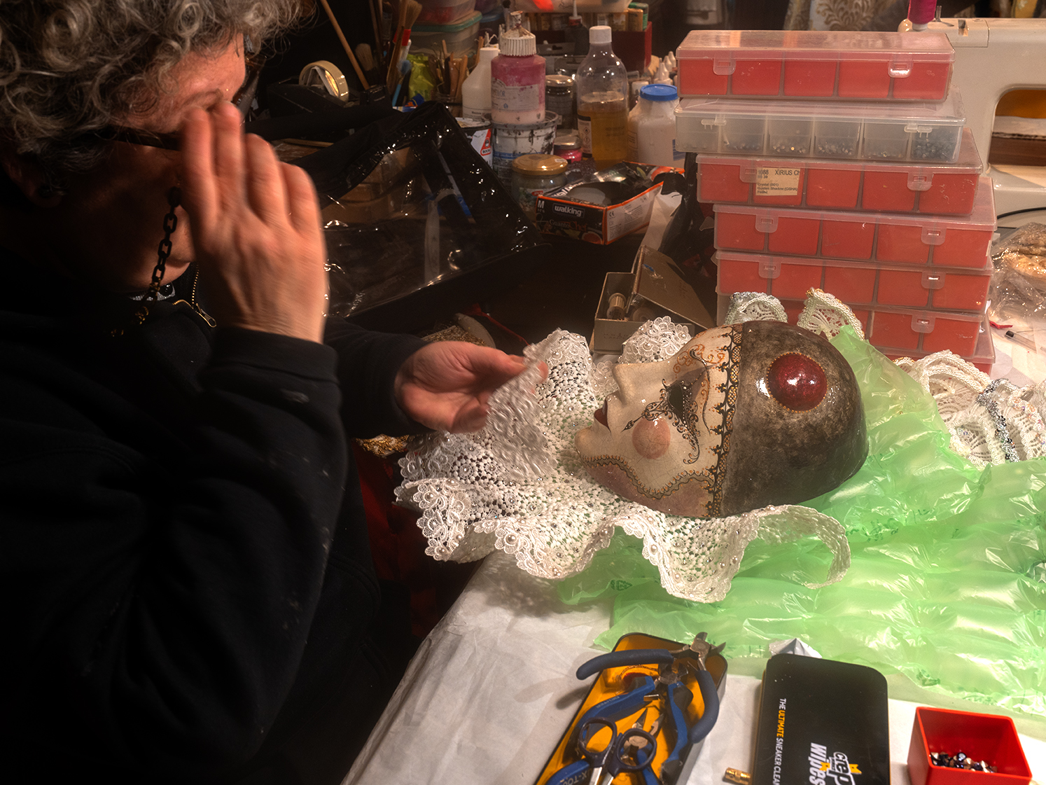 Firstly, I was able to go into the workshop and take some images of the craftswomen at work, then we went over to the shop where we met the man who is responsible for Ca’ del Sol. When asked how long they had been in business and if he was the owner, he seemed insulted and protested that he was a craftsman who took pride in his work and whose work gave him joy. For thirty-seven years he has made masks and costumes for Carnivale.