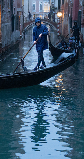 Almost the last gondolier with a group of Australian tourists braving the rain towards the end of a chilly afternoon.
