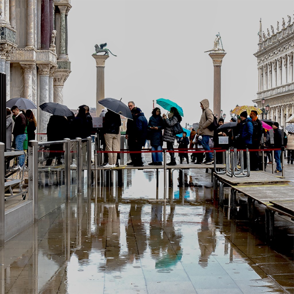Wet, grey, but quite bright, this scene in St. Mark’s Square caught my eye immediately with its colourful reflections and also reminded me of a fleeting moment on my first day in the city when I wondered why there were so many areas set up for Khantoke (traditional Thai) dinners: gradually I realised that these low ‘tables’ were not tables at which to eat, but raised areas on which to walk in case of floods!!! Today there will have been some dry feet as a result of them.