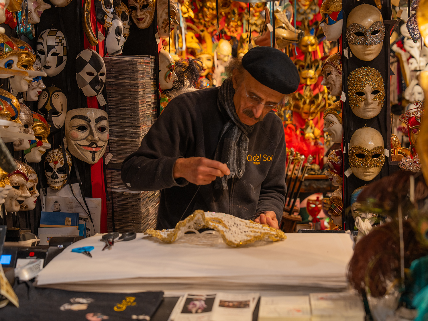 But it was in the shop the other side of the canal where we met the artisan whose pride is in Ca’ del Sol, surrounded by the masks for which he is famous.