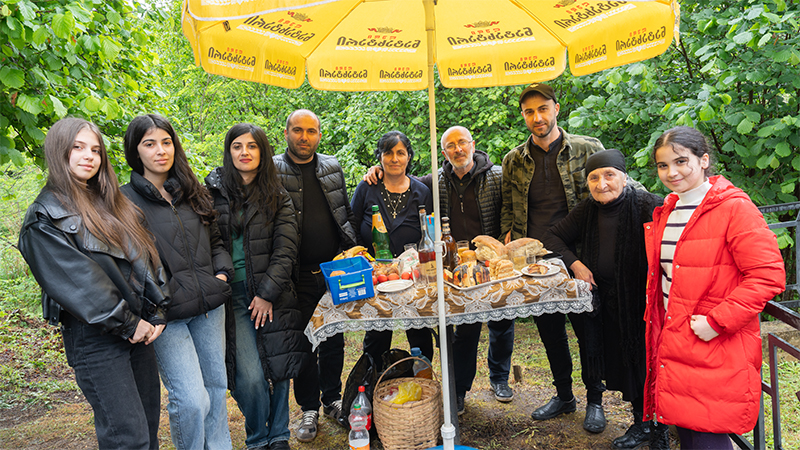 Having given us food and drink for a toast, they were keen to be photographed with even the oldest family member getting up from the step where she was safely sheltering under her umbrella came to join in. Children here will remember even their great-grandparents with traditions like this. The feast includedKhachapuri and salads and paske cake: the best paske cake I’d had so far, topped with a layer of chocolate. Each plot has it’s own table permanently in place for occasions such as this so all they had to do was bring the umbrella to keep them dry on a drizzly Easter Monday.