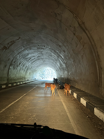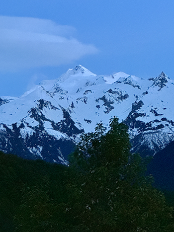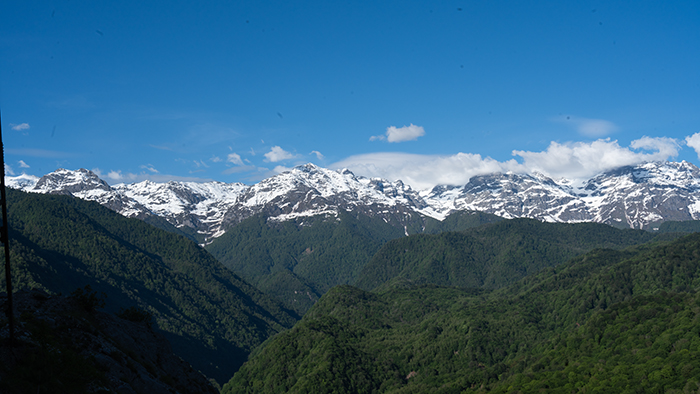 Despite various hazards – cows, missing bits of road, crazy drivers and all the usual concerns on mountain roads – we were on track to arrive at a very special place before the light failed. We managed it – just! To find yet another amazing welcome, more food, a lovely warm fire and a heated bedroom with another gorgeous view of the High Caucasus to wake up to.