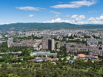 This huge construction is on top of a hill overlooking the Tbilisi Sea (a man-made reservoir providing water to the city) in one direction and some of the older suburbs in the other. Some interesting buildings mark the Soviet era developments.