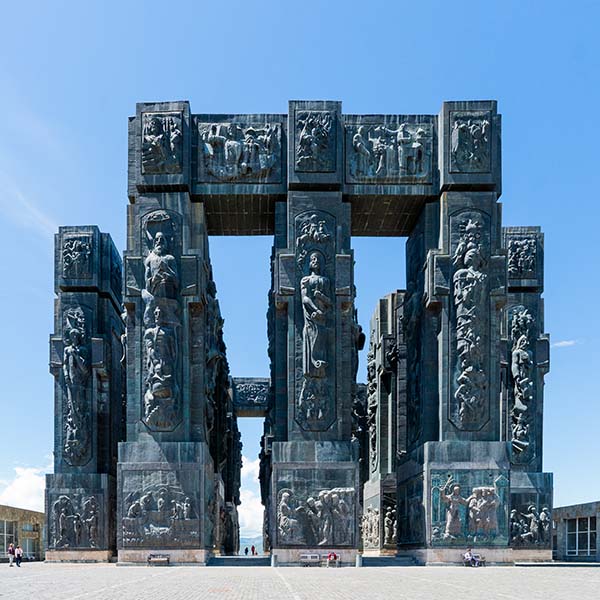 The Chronicles of Georgia – created by the Georgian-Russian sculptor and architect Zurab Konstantinovich Tsereteli – consists of sixteen pillars each between 30 and 35 metres high, the top half of each illustrates the life of kings and queens while the lower half depicts scenes from the life of Christ, marking the significance of Georgia in the spread of Christianity.