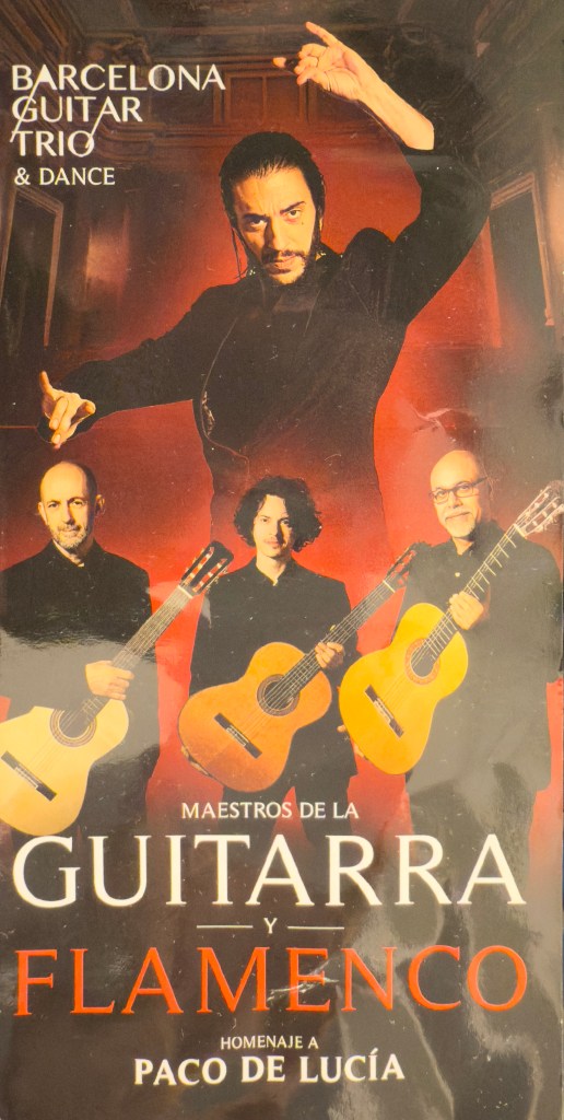 A leisurely journey back to Pl. de Catalanya and we were ready for lunch and to find out some details about the concert I had seen advertised. I had already decided I would go but my companions wanted to be certain it was for them. Our lunch stop was very near the venue so we stopped to ask and were immediately advised by the very friendly ticket salesman that this was one of the best of its kind. Three of Spain’s best guitarists and a renowned flamenco (no, not flamingo!!!) dancer. A few hours later we were able to agree: he wasn’t wrong.