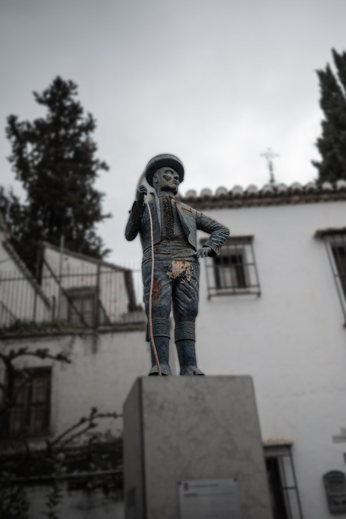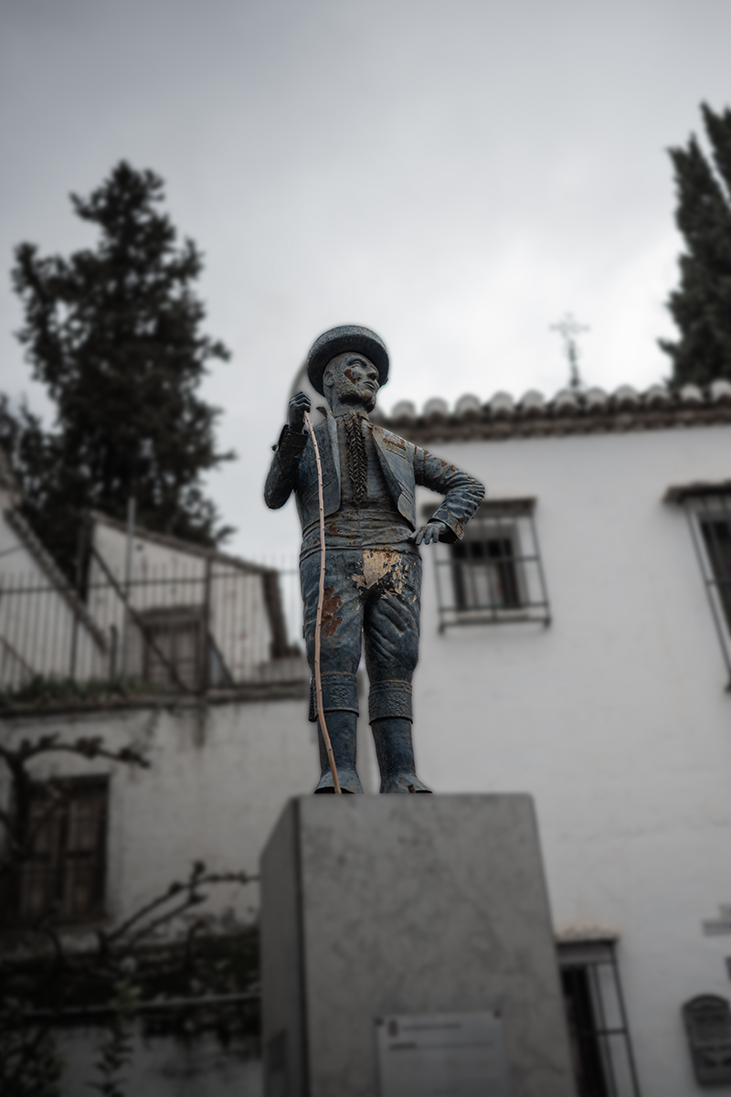 The King of the Gypsies looks down on two elderly men enjoying a convivial chat under his statue.